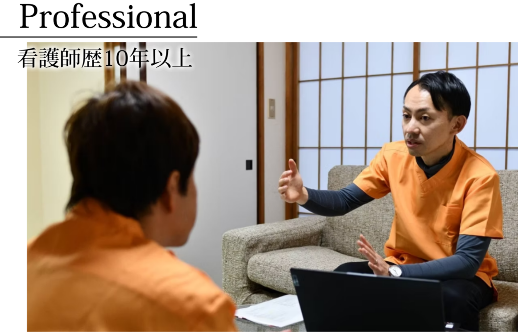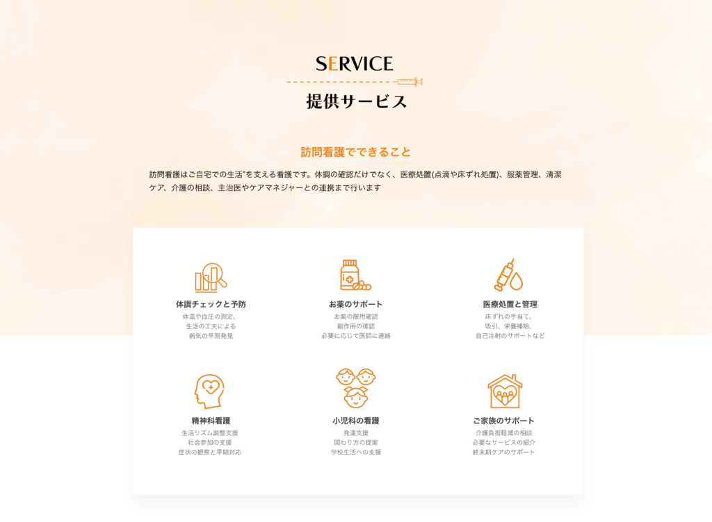 健康状態の確認、服薬管理、医療的ケア、日常生活のご相談など、ご利用者様の状態に合わせたサポートを行います。ご自宅で安心して過ごせるよう、一人ひとりに合わせて支援いたします。