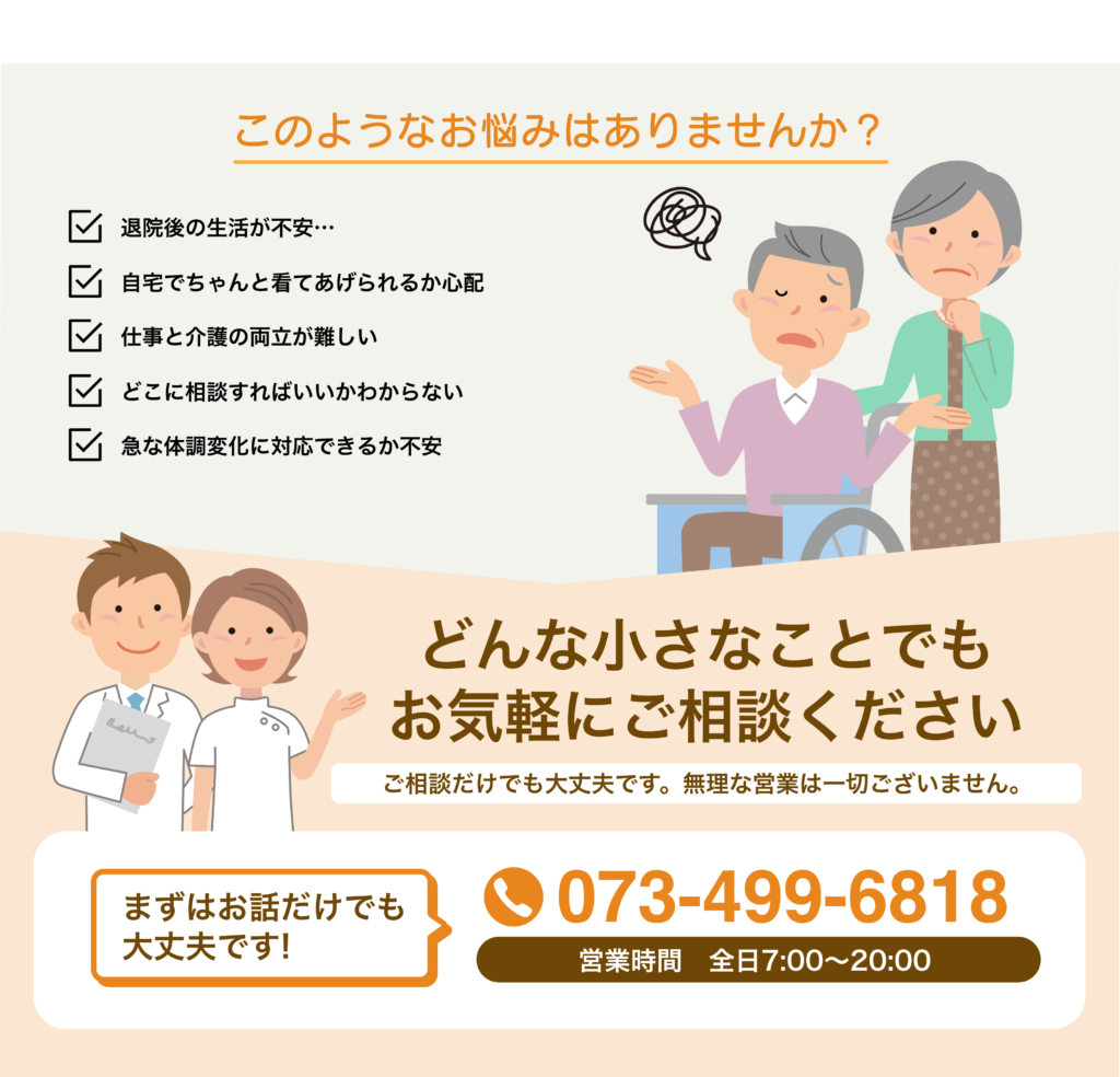「退院後が不安」「家で看ていけるか心配」…そんな時は、まずはご相談ください。